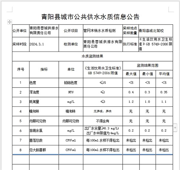 名稱: 青陽縣城市2024年3月1日管網水“7項”指標公示 文號:
