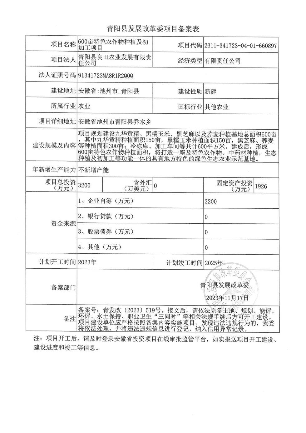 名稱: 600畝特色農作物種植及初加工項目 文號: