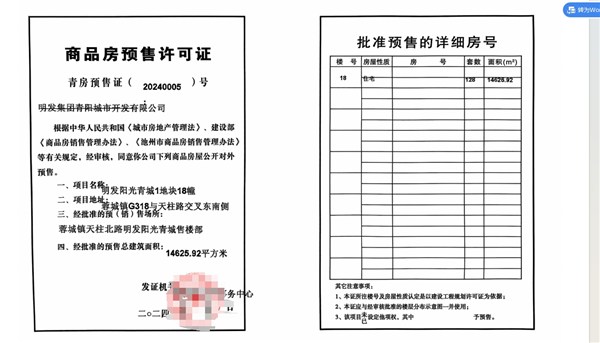 名稱: 明發(fā)陽(yáng)光青城1號(hào)地塊18#預(yù)售許可證 文號(hào):