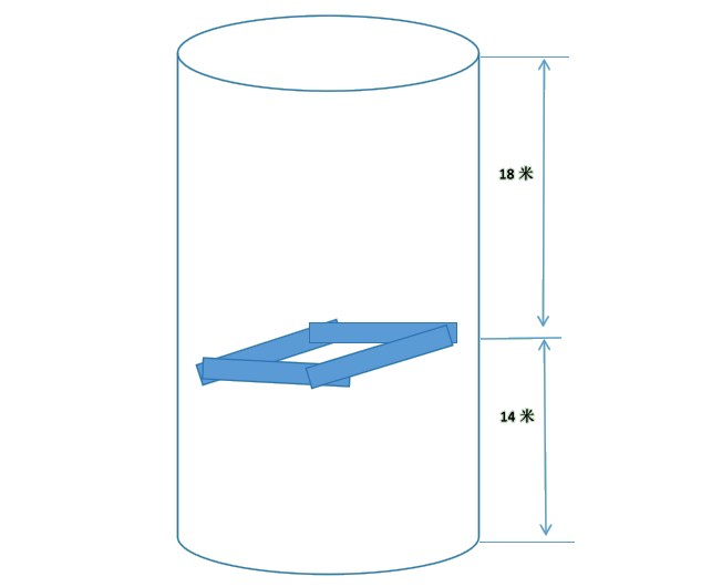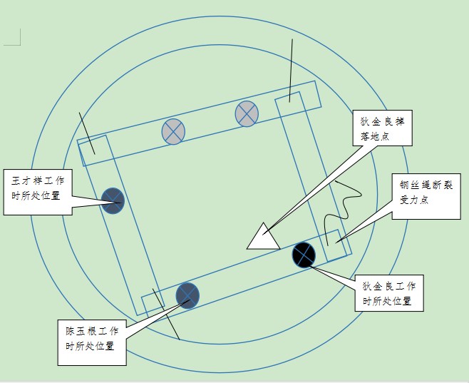 作業(yè)人員站立的跳板平臺(tái)距窯底約14米,距窯頂約18米(見(jiàn)圖2 事故現(xiàn)場(chǎng)示意圖)。跳板平臺(tái)呈矩形,由4根鋼絲繩固定4角,鋼絲繩另一端系在窯頂橫梁上(見(jiàn)圖3 事故現(xiàn)場(chǎng)結(jié)構(gòu)示意圖,見(jiàn)圖4 事故現(xiàn)場(chǎng)俯視圖)。