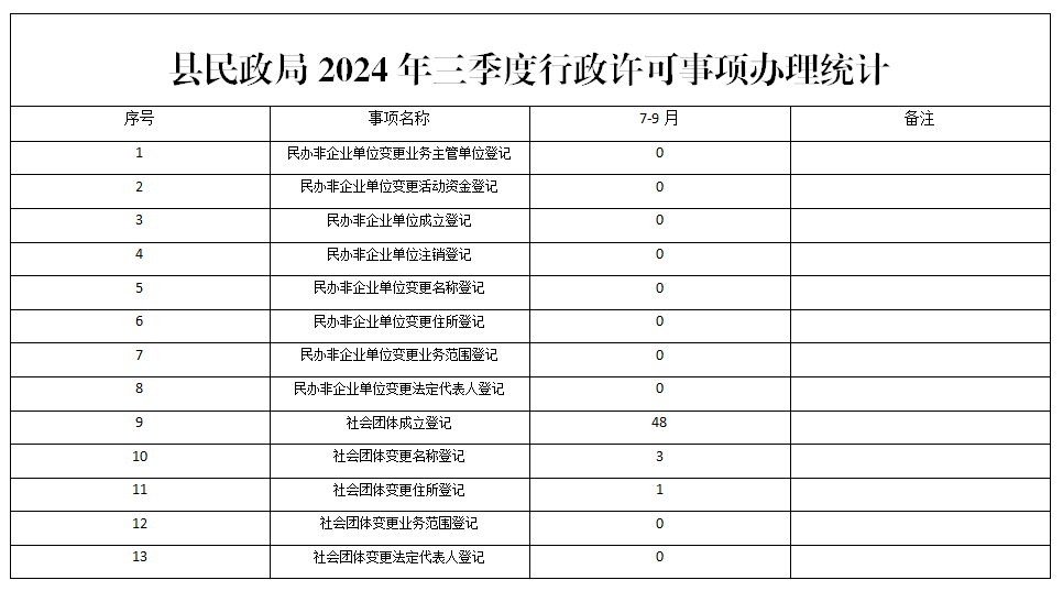 縣民政局2024年三季度行政許可事項(xiàng)辦理統(tǒng)計(jì)