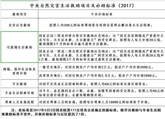根據2017年5月3日國務院第171次常務會議確定,以下標準,一般受災地區:因災倒房戶為2萬元,損房為0.2萬元。