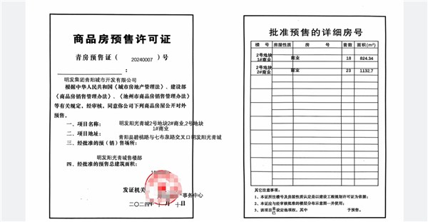 名稱: 明發陽光青城2號地塊1#、2#商業預售許可證 文號: