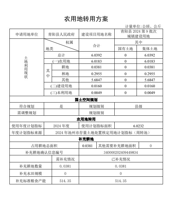 名稱: 青陽縣2024年第9批次農用地轉用方案 文號:
