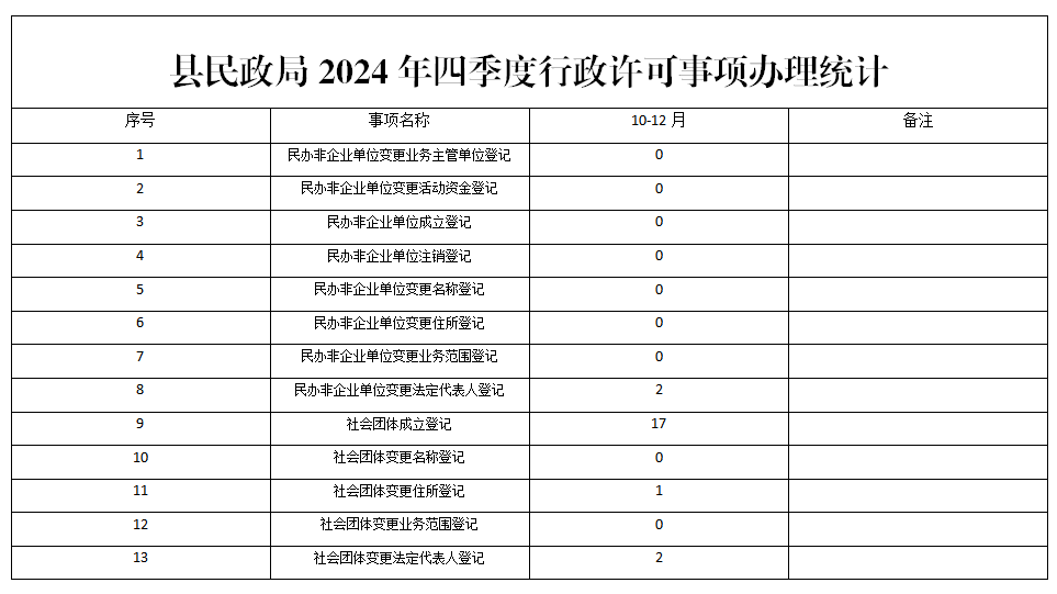 名稱: 縣民政局2024年四季度行政許可事項辦理統(tǒng)計 文號: