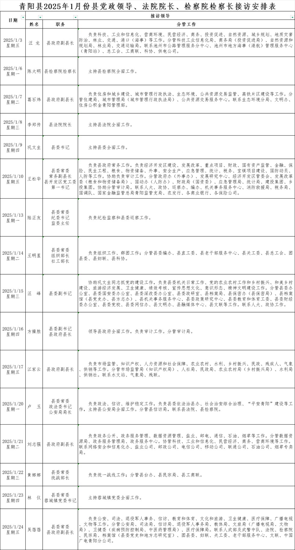 青陽縣2025年1月份縣黨政領導、法院院長、檢察院檢察長接訪安排