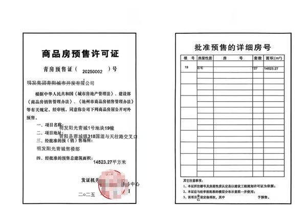 名稱: 明發陽光青城1號地塊19幢商業預售許可證 文號: