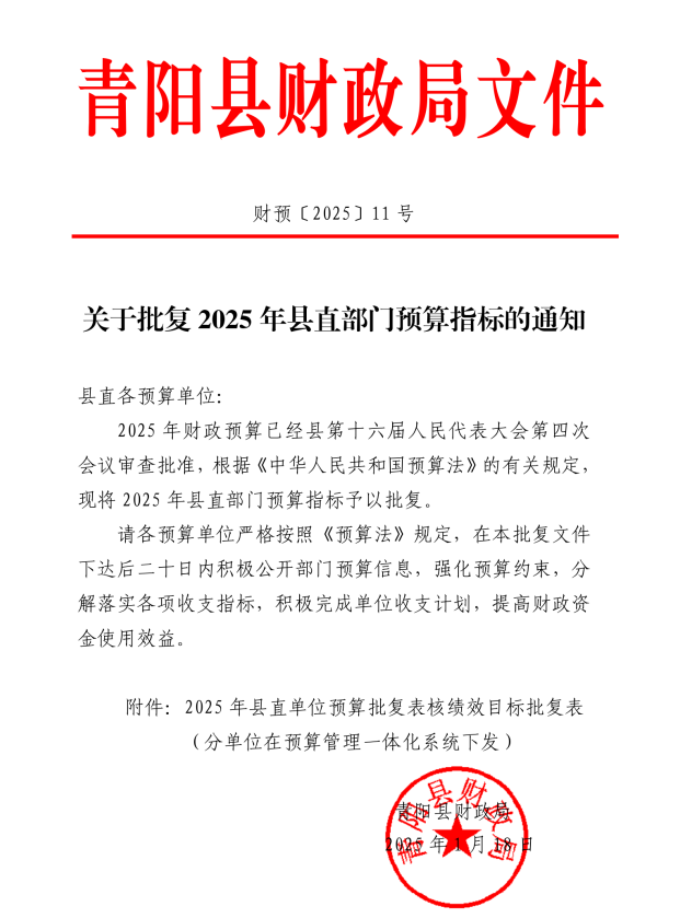名稱: 青陽縣民政局2025年預算指標批復公示 文號: