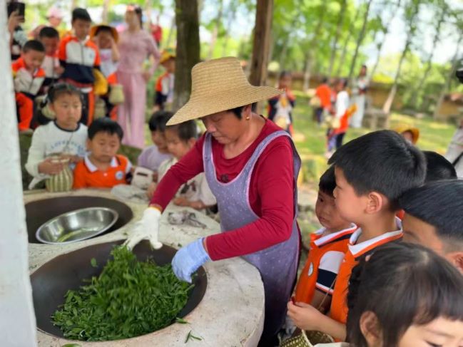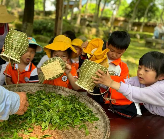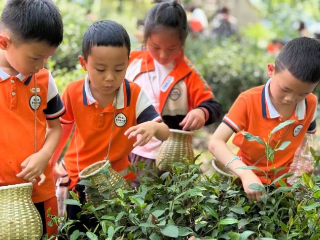 茶樹郁郁蔥蔥,茶香四溢,孩子們興奮地穿梭在茶樹間,體驗著采茶勞動樂趣,近距離感受傳統制茶工藝的獨特魅力。