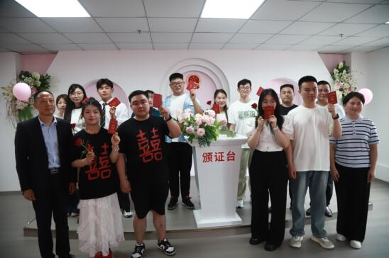 三、集體頒證,誓言永恒。上午10:10在頒證廳舉辦了小型集體頒證儀式,邀請(qǐng)市政協(xié)委員、縣政協(xié)副主席周肖萌和縣政協(xié)委員、縣民政局黨組書(shū)記、局長(zhǎng)謝義三擔(dān)任特邀頒證師為5對(duì)新人集體頒證,通過(guò)莊重、溫馨的頒證儀式,強(qiáng)化婚姻登記的儀式感與社會(huì)意義,同時(shí)傳遞新時(shí)代婚俗改革的理念,引導(dǎo)新人摒棄高價(jià)彩禮、鋪張浪費(fèi)等陋習(xí),弘揚(yáng)“簡(jiǎn)約適度、健康向上”的婚戀觀。