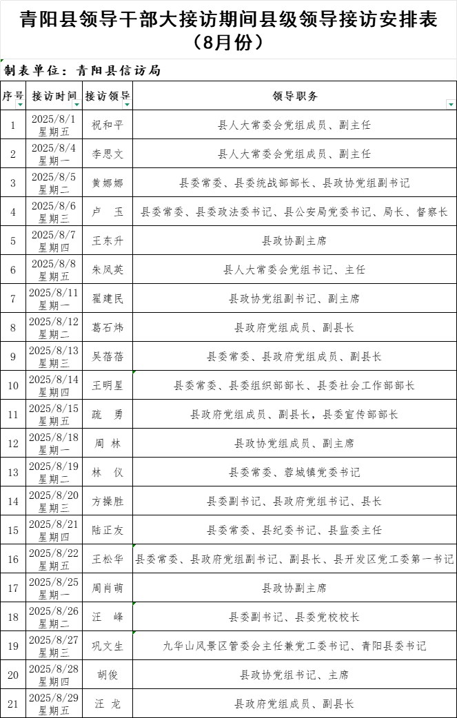 青陽縣領導干部大接訪期間縣級領導接訪安排表
