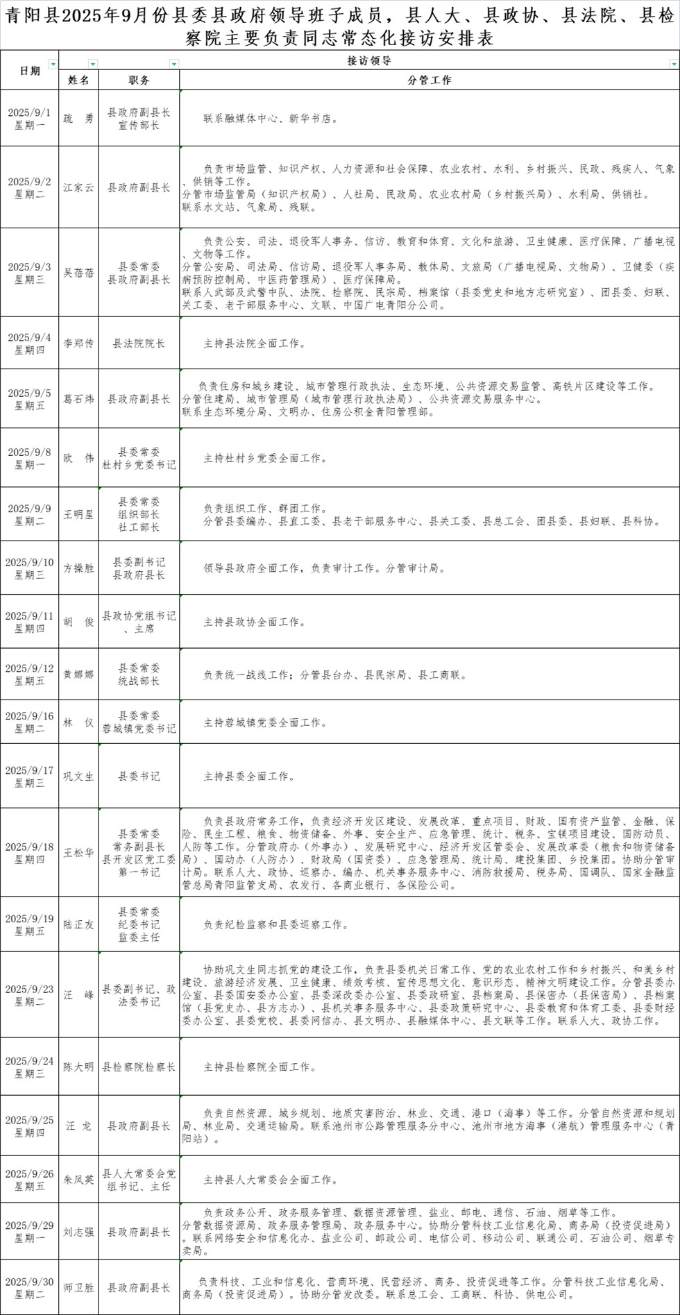 青陽縣2025年9月份縣委縣政府領導班子成員,縣人大、縣政協、縣法院、縣檢察院主要負責同志常態化接訪安排