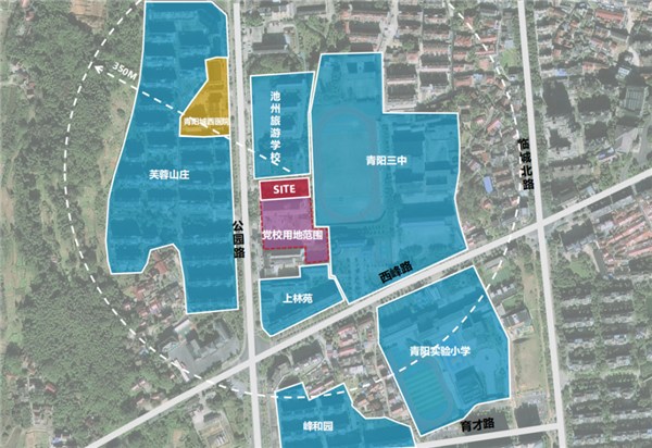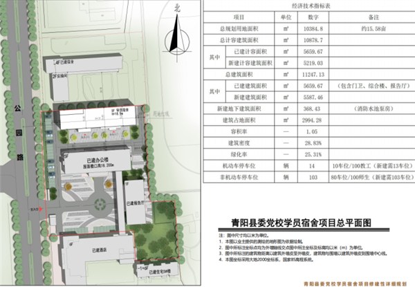 項目位于青陽縣城區縣委黨校內部,北側為池州旅游學校,南側為黨校辦公樓,西側為公園路,東側為青陽三中。擬利用其內部空地建設黨校學員宿舍。本次規劃用地10384.8平方米(約15.58畝),總建筑面積11250.13平方米,總計容建筑面積10880.95平方米,容積率1.05,建筑密度55%,綠地率25.31%。其中已建建筑面積5659.67平方米,新建宿舍樓建筑面積5590.46平方米。項目方案經第9次青陽縣自然資源和規劃(林長制及綠化)委員會議審議優化完善。今現根據有關規定,特對青陽縣委黨校學員宿舍項目建筑設計方案進行批前公示。