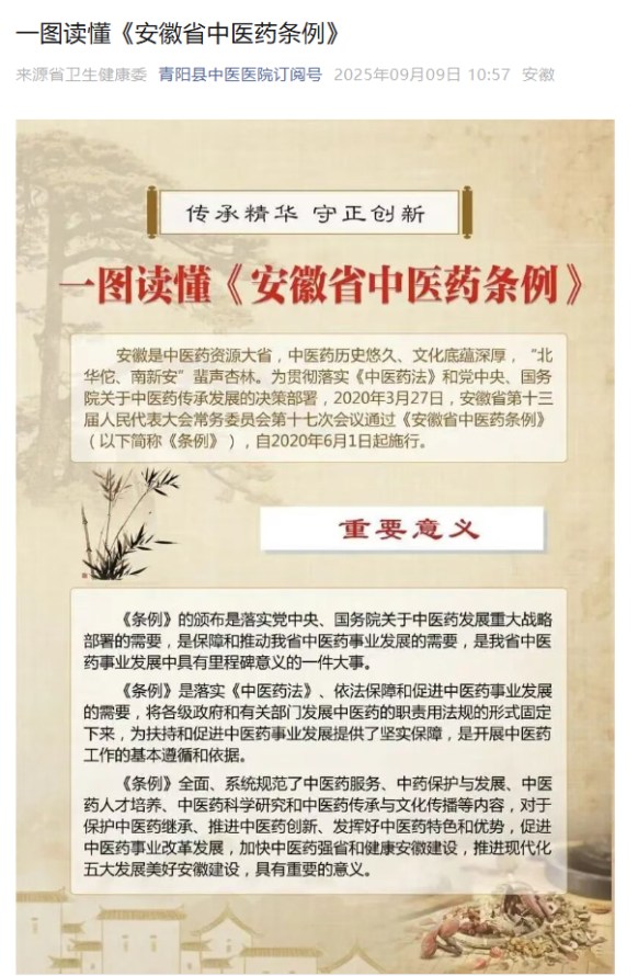 2025年9月8日-14日是安徽省中醫藥宣傳周,為進一步貫徹落實《安徽省中醫藥條例》,弘揚中醫藥文化,提升群眾中醫藥健康素養,青陽縣開展系列主題宣傳活動。