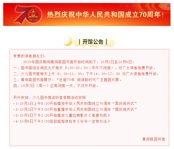 【通知公告】青陽縣圖書館國慶假期對外免費開放時間安排