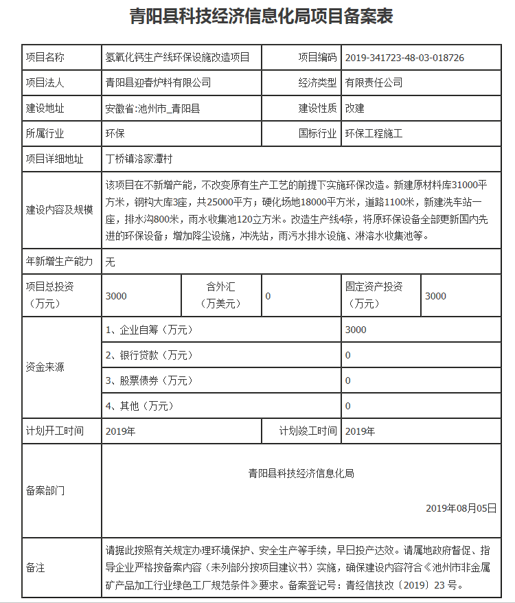 青陽縣迎春爐料有限公司氫氧化鈣生產線環保設施改造項目備案