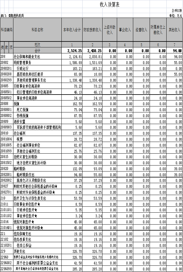 2017年度收入總計2,747.98萬元(含用事業基金彌補收支差額和年初結轉結余223.73萬元),支出總計2747.98萬元 (含結余分配和年末結轉結余368.67萬元)。與2016年相比,收入增加10.22萬元,支出減少134.74萬元。主要原因是本年度決算中項目資金減少,主要是退役安置費和自然災害救助。