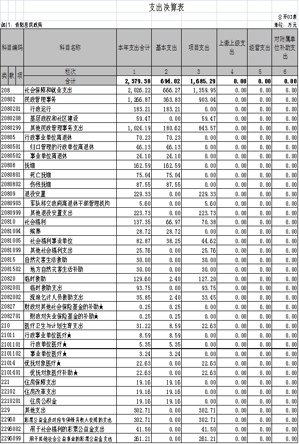 2017年度決算項目支出1,685.29萬元,“社會保障和就業支出” 1,359.95萬元,其中:“基層政權和社區建設”59.47萬元,主要用于第二次地名普查工作和社區建設,“其他民政管理事務支出”843.57萬元,主要用于社區網格化建設、困難老人生活救助,五保孤兒春節慰問等支出;“退役安置”229.33萬元,主要用于對軍休管理機構的人員、工作經費及兩個年度退役士兵的安置補助;“自然災害生活救助”30萬元,主要用于受災困難群眾的生活救助及抗洪救災工作等,“臨時救助支出”127.2萬元,主要用于困難群眾的臨時生活救助;“社會福利”70.38萬元,主要用于對鄉鎮敬老院補助?!搬t療衛生與計劃生育支出”22.63萬元,主要用于優撫對象醫療費;“其他支出”302.71萬元,主要用于福彩公益金補助項目支出。