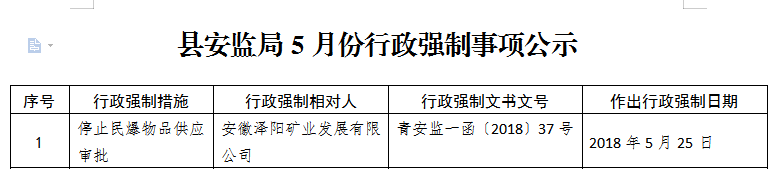 縣安監局5月份行政強制事項公示
