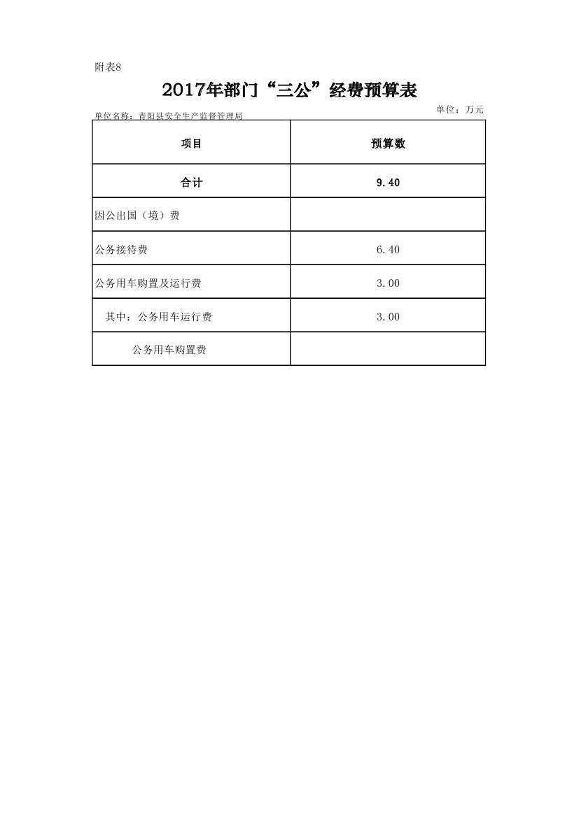 2017年,“三公”經費財政撥款預算數為9.4萬元,比2016年減少1.1萬元。其中:因公出國(境)費0萬元;公務接待費6.4萬元;公務用車購置及運行費3萬元。公務接待費預算6.4萬元,主要用于接待各級工作來訪、工作調研及開展安全監管執法活動等公務支出。經費使用貫徹中央八項規定和省委省政府30條要求,嚴格執行《黨政機關厲行節約反對浪費條例》。