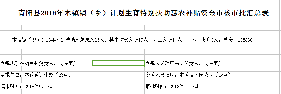 名稱: 2018年木鎮鎮計劃生育特別扶助惠農補貼資金審核審批匯總表 文號:
