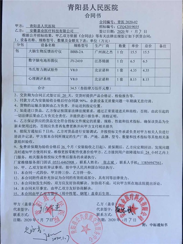 名稱: 青陽縣人民醫院精神科門診設備采購及安裝項目合同書 文號: