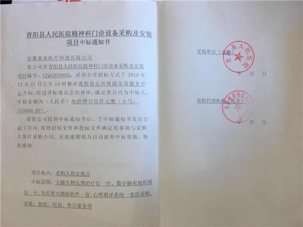 青陽縣人民醫院精神科門診設備采購及安裝項目中標通知書
