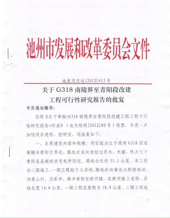 關(guān)于G318南陵界至青陽段改建工程可行性報(bào)告的批復(fù)