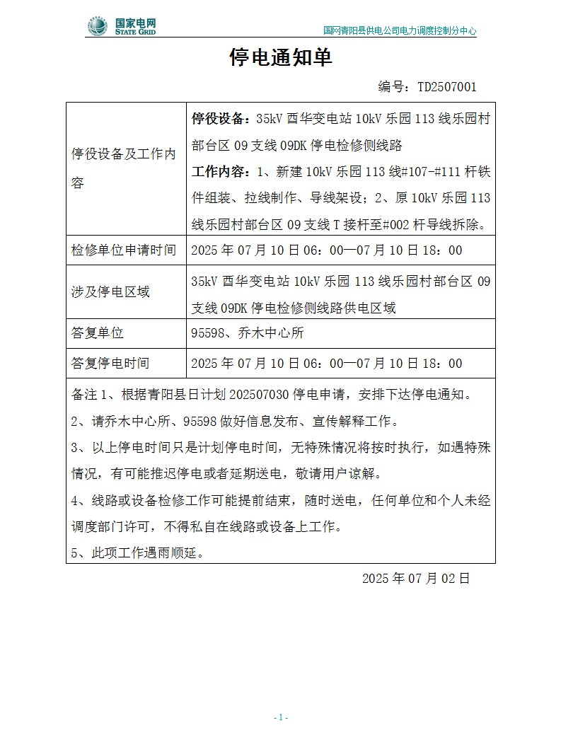2025年7月10日電網(wǎng)檢修公告