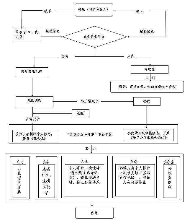 (二)建立工作協同機制。建立“一窗對外、信息共享、分工負責、部門協作、整體服務”的工作機制。各部門立足職能、主動協同,做好相關工作。民政部門牽頭抓總,做好協調對接、遺體火化證明開具(火化區)等工作。衛生健康部門負責醫療機構調查、開具正常死亡和經醫療救治無效后死亡人員的《死亡證》等工作。公安部門負責開具未經醫療衛生機構救治的非正常死亡人員《居民非正常死亡證明》、死亡或宣告死亡辦理戶口注銷、注銷駕駛證等工作。人社部門負責企業職工和城鄉居民養老保險個人賬戶一次性待遇申領、遺屬(撫恤)等待遇申領、參保人員死亡后停止參保關系等工作。住房公積金管理部門負責配合繳存單位終止逝者住房公積金繳存關系,封存住房公積金賬戶,依規辦理死亡提取等工作。醫保部門負責參保人員個人賬戶一次性支取(基本醫療保險)、參保人員關系終止等工作。政務服務中心負責綜合受理窗口設置、平臺技術支持、標準化工作規程和辦事指南審核等工作。各業務主管部門充分依托安徽省大數據平臺歸集共享“公民身后一件事”辦理相關數據,構建主題數據庫,推進跨部門跨系統數據共享、業務協同。