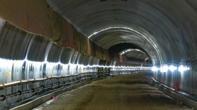 本次實現貫通的4號隧道是整個廊道工程中最長的隧道,全長約1585米,位于4條穿山隧道的末端,是未來白云石從礦山開采后,運往廠區進行加工的最后一站。自2023年7月隧道開挖以來,面對絕大多數的三級、四級甚至五級圍巖,中鐵二十五局團隊利用TSP和地震波等先進技術,并不斷優化襯砌方法、調整支護形式,形成一系列科技創新成果,大幅縮減了混凝土超耗率和施工工期,克服了復雜地質條件對施工的嚴峻挑戰,確保了施工安全與質量。