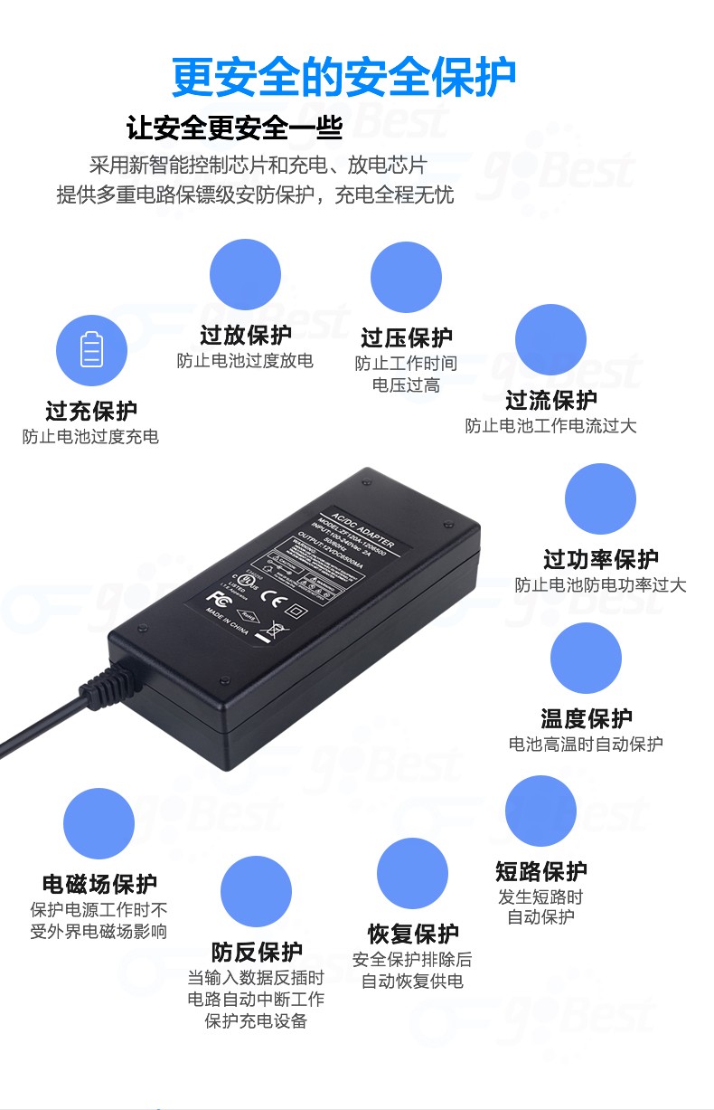 • 采用前沿IC控制方案和先進的制造工藝,高精度,低噪音;過壓,過流,過充,短路等多重保護。