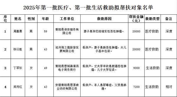 經職工申請,基層工會初審,縣總工會權益保障部審核,縣總工會擬對第一批2名困難職工家庭提供醫療救助、第一批2名困難職工家庭提供生活救助幫扶。