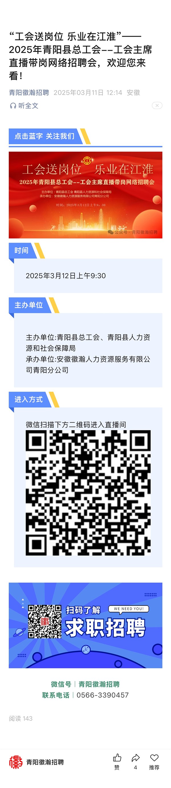 “工會送崗位 樂業在江淮” 2025年青陽縣總工會--工會主席直播帶崗網絡招聘會